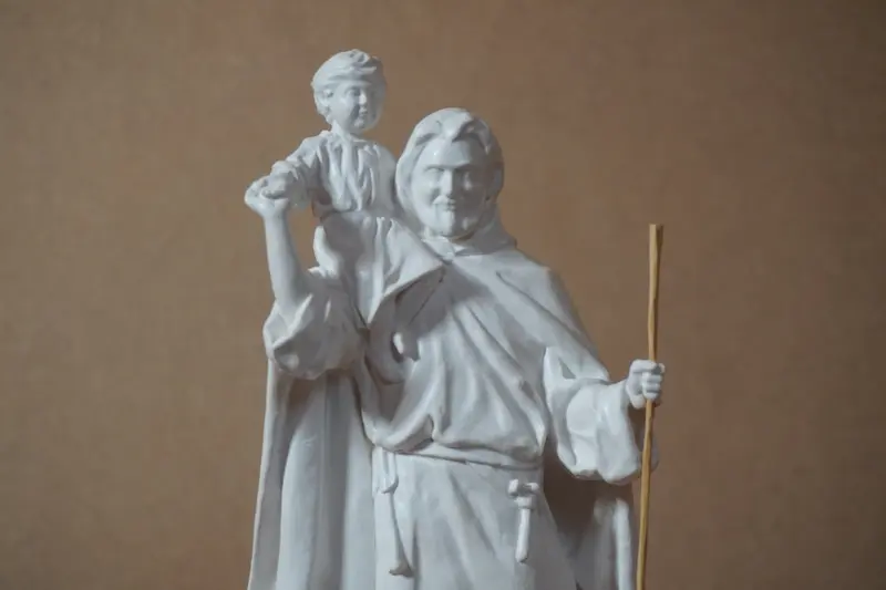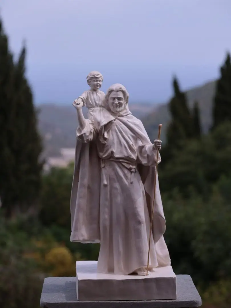 I wanted Joseph to be joyful, young and in the fullness of life. Because if Mary fell in love with him – we know that people married much younger at the time and that Mary was about 16 – I couldn’t imagine Joseph with grey hair. Joseph therefore proudly carries the Son of God on his shoulders, staff in hand, inviting us to courageously take control of our lives too and offer them to the world.