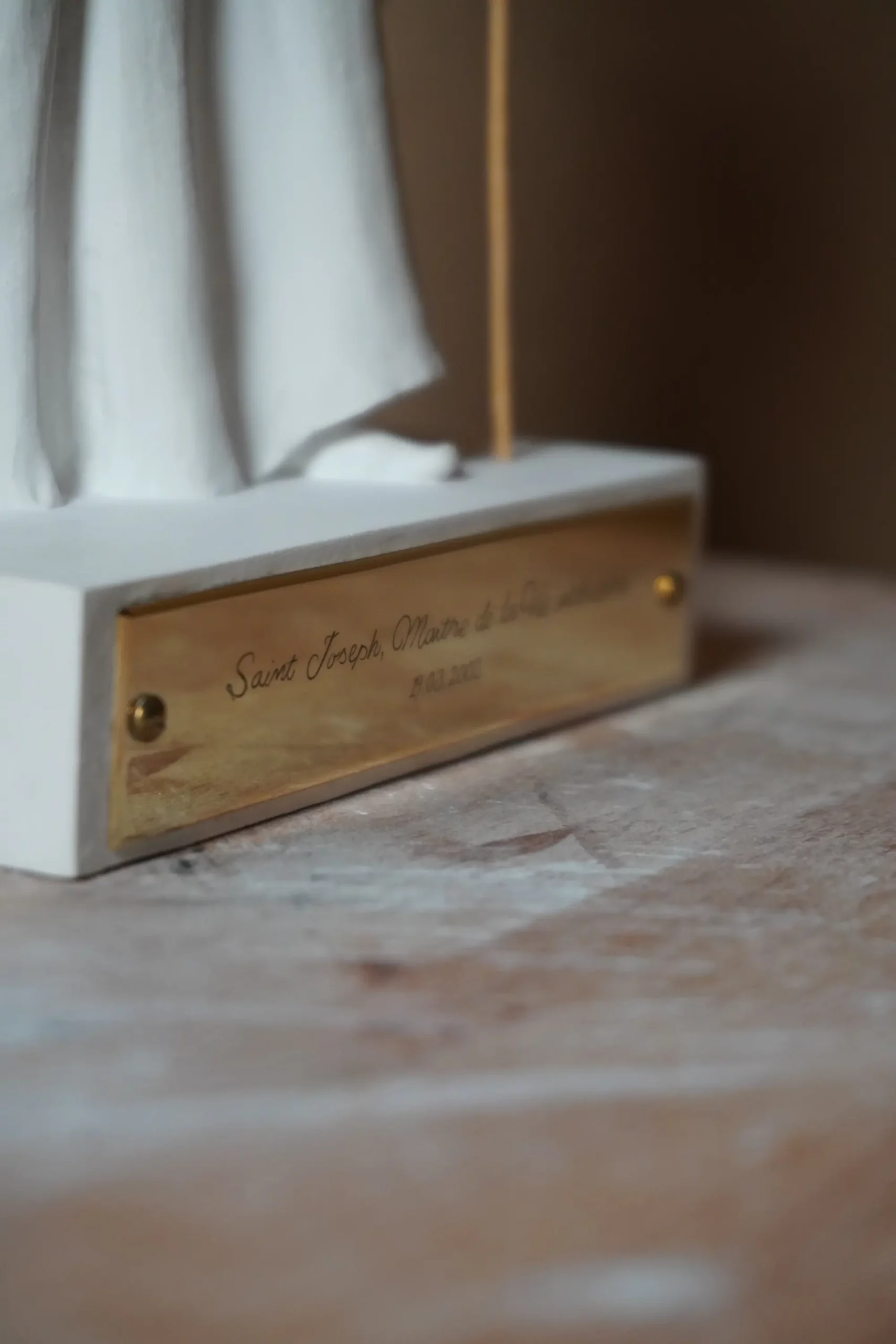 Une plaque en laiton peut aussi être gravée sur-mesure selon les désirs du client et fixée sur le socle de la statue.