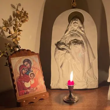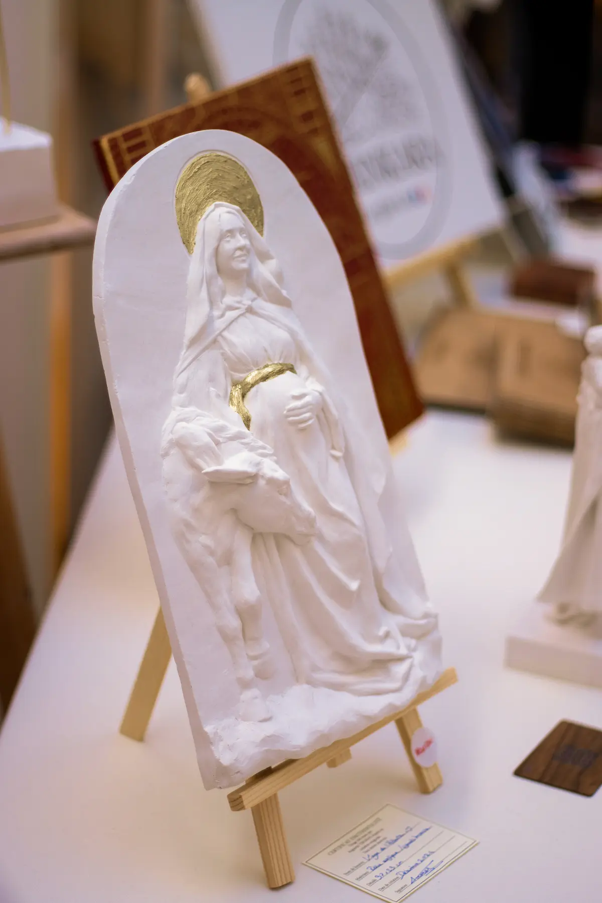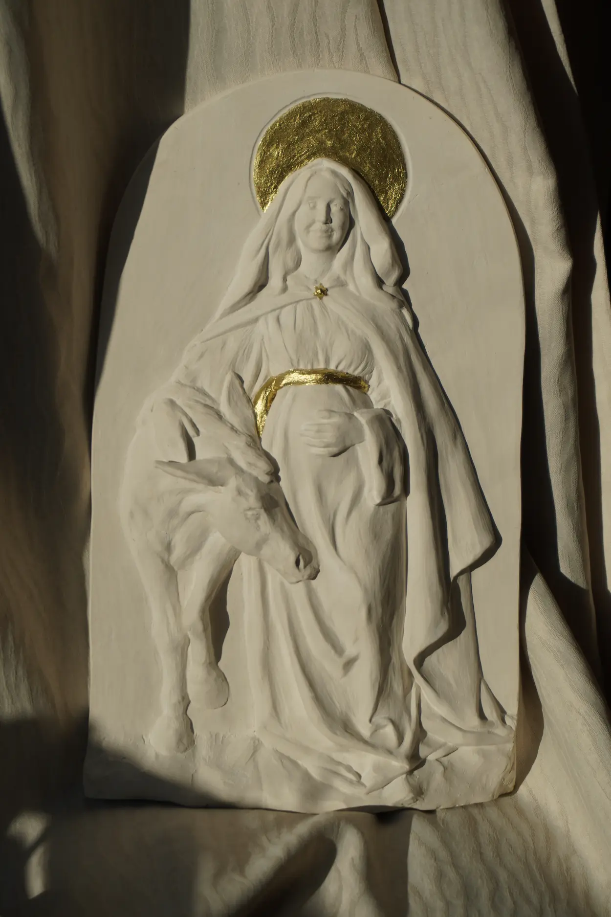 J’ai imaginé une Marie joyeuse et pleine de gratitude, avançant vers Bethléem avec son âne. Dans son regard, on devine sa pensée tournée vers un mystère plus grand qu’elle — simple jeune femme de Palestine, elle est choisie pour porter en elle le Messie et devenir ainsi la mère de Dieu.
